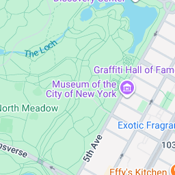 East Side from 104th-106th streets. Enter at Fifth Avenue and 105th Street, or 106th Street gate inside the park.
